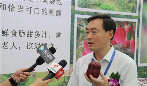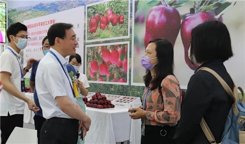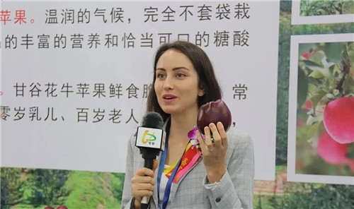 副县长杜兴为广州市商务局会展处副处长、广州商务会展促进服务中心副主任陈建莎介绍甘谷苹果