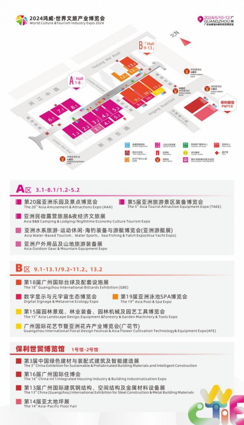 2024鸿威·世界文旅产业博览会将于5月10-12日在广州·中国进出口商品交易会展馆举办:展览面积达24.7万平方米,AB区联动,参展企业近4000家,将吸引20万观众参与。本届博览会分设游乐文旅、数字文旅、康养文旅、景观文旅、休闲文旅、水系文旅六大版块,展览范围包括游戏游艺、主题公园、室内乐园、景区装备、文旅科技、夜游演艺、民宿/旅居/露营、旅游车船/运动休闲车、泳池SPA、元宇宙、AR/VR、数字显示、数字体育、园林景观、花卉园艺、水上运动休闲用品/海钓装备/游艇、台球及配套设施等,所涉细分领域涵盖60%以上的文旅产业。博览会同期举办2024世界文旅大会等30多场会议论坛活动,汇聚100+顶级重磅嘉宾、300+行业主管单位及相关机构代表/企业负责人代表、2000+文旅从业者、2000万+线上观众倾情参与,线下将吸引2万+专业观众参会,致力汇聚全球智慧,共谋产业繁荣。